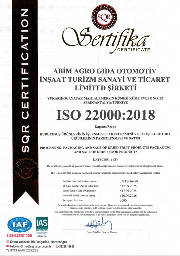 Abim Agro Gıda, müşteri memnuniyetini odağına alarak, kaliteli ve yenilikçi kuruyemiş ürünleriyle güvenilir bir çözüm ortağı olmayı, ulusal ve uluslararası ölçekte tercih edilen lider marka haline gelmeyi vizyon edinmiştir.